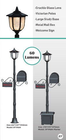 ·Crackle Glass Lens ·Victorian Poles ·Large Study Base ·Metal Mail Box ·Welcome Sign 60 Lumens Size:265*230*1950mm Model:SP1P684 Size: 370*370*1975mm Model: SP1P684-Planter 27