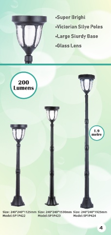 •Super Bright •Victorian Stlye Poles •Large Sturdy Base •Glass Lens 200 Lumens 1.9 metre Size: 240*240*1125mm Size: 240*240*1530mm Size: 240*240*1925mm Model:SP1P422 Model:SP1P423 Model:SP1P424 4