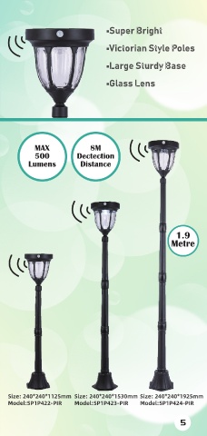 •Super Bright •Victorian Style Poles •Large Sturdy Base •Glass Lens MAX 8M 500 Dectection Lumens Distance 1.9 Metre Size: 240*240*1125mm Size: 240*240*1530mm Size: 240*240*1925mm Model:SP1P422-PIR Model:SP1P423-PIR Model:SP1P424-PIR 5