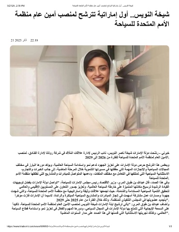 ًاﺪﯿﻛﺄﺗ ،ﺔﺣﺎﯿﺴﻠﻟ ةﺪﺤﺘﻤﻟا ﻢﻣﻷا ﺔﻤﻈﻨﻤﻟ مﺎﻌﻟا ﻦﯿﻣﻷا ﺐﺼﻨﻤﻟ ﺲﯾﻮﻨﻟا ﺔﺨﯿﺷ تارﺎﻣﻹا ﺔﻨﺑا ﺢﯿﺷﺮﺗ ﻲﺗﺄﯾ" :يﺮﻤﻟا قﻮط ﻦﺑ ﷲﺪﺒﻋ فﺎﺿأو
