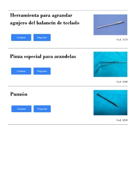 Herramienta para agrandar agujero del balancín de teclado Cod. 3170 Pinza especial para arandelas Cod. 3180 Punzón Cod. 3230