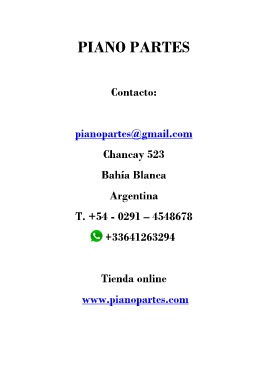 PIANO PARTES Contacto: pianopartes@gmail.com Chancay 523 Bahía Blanca Argentina T. +54 - 0291 – 4548678 +33641263294 Tienda online www.pianopartes.com