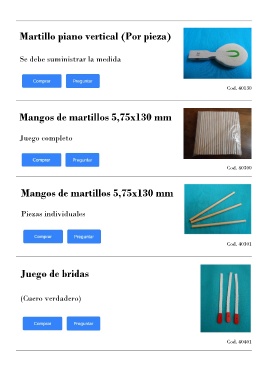 Martillo piano vertical (Por pieza) Se debe suministrar la medida Cod. 40130 Mangos de martillos 5,75x130 mm Juego completo Cod. 40300 Mangos de martillos 5,75x130 mm Piezas individuales Cod. 40301 Juego de bridas (Cuero verdadero) Cod. 40401