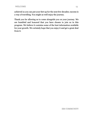 Thank you for allowing us to come alongside you on your journey. We are humbled and honored that you have chosen to join us in this program. We believe it contains some of the best information available for your growth. We certainly hope that you enjoy it and get a great deal from it.