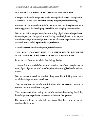 We can learn from experience, but not solely physical world experience. By developing our imagination and having the discipline to practice, we can also develop, learn and grow from Mental Movie Experience or what Maxwell Maltz called Synthetic Experience.