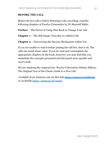 Before the live call or before listening to the recording, read the following chapters of Psycho-Cybernetics by Dr Maxwell Maltz: