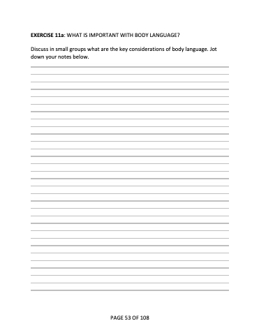 EXERCISE 11a: WHAT IS IMPORTANT WITH BODY LANGUAGE? Discuss in small groups what are the key considerations of body language. Jot down your notes below. PAGE 53 OF 108