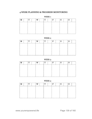 4 WEEK PLANNING & PROGRESS MONITORING WEEK-1 MTWTFSS WEEK-2 MTWTFSS WEEK-3 MTWTFSS WEEK-4 MTWTFSS www.yourempowered.life Page 139 of 160