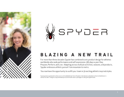 strictly forbidden. Failing to comply with these policies will result in loss of privileges for selling the Spyder brand.
