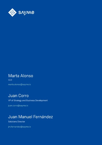 Marta Alonso CEO marta.alonso@sayme.io Juan Corro VP of Strategy and Business Development juan.corro@sayme.io Juan Manuel Fernández Solutions Director jm.fernandez@sayme.io 52 53
