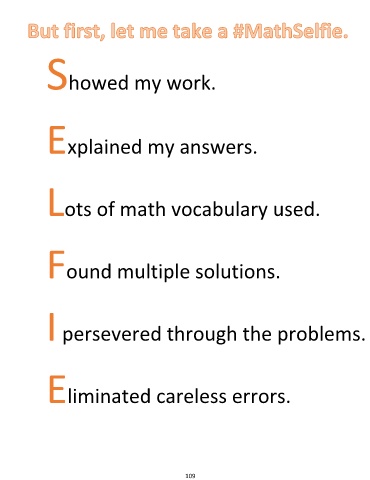 Showed my work. Explained my answers. Lots of math vocabulary used. Found multiple solutions. I persevered through the problems. Eliminated careless errors. 109