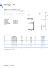 EURO 90 SYSTEM 12 Plug-in units 6HE EURO 90 modular plug-in units Front dimension This modular drawer can be fitted into 6U EURO 90 subrack or caseframe through four standard card guide (see 0577... part number). The plug-in unit allows one or two double 233.4 x 160, 233.4 x 220, 233.4 x 280 EURO cards that can be entered through grooves to the left or right. In the back panel there are 2 groves to be used for connections. Horizontal or vertical drawer covers are supplied upon request. Contents of kit: 1 front panel Alodine 1000 1 rear panel Alodine 1000 4 side extrusion Alodine 1000 1 extruded handle Alodine 1000 Fixings Side view Rear view Ordering information Unit Description A B C D Order code 6HE Plug-in 6/160 14TE 70.78 167 66.18 39.68 C0735-64A 6HE Plug-in 6/160 15TE 75.86 167 71.26 44.94 C0735-65A 6HE Plug-in 6/160 18TE 91.1 167 86.5 60.18 *C0735-66A 6HE Plug-in 6/160 21TE 106.34 167 101.74 75.42 C0735-67A 6HE Plug-in 6/220 14TE 70.78 227 66.18 39.68 C0735-71A 6HE Plug-in 6/220 15TE 75.86 227 71.26 44.94 C0735-72A 6HE Plug-in 6/220 18TE 91.1 227 86.5 60.18 *C0735-73A 6HE Plug-in 6/220 21TE 106.34 227 101.74 75.42 C0735-74A 6HE Plug-in 6/280 14TE 70.78 287 66.18 39.68 C0735-78A 6HE Plug-in 6/280 15TE 75.86 287 71.26 44.94 C0735-79A 6HE Plug-in 6/280 18TE 91.1 287 86.5 60.18 *C0735-80A 6HE Plug-in 6/280 21TE 106.34 287 101.74 75.42 C0735-81A * M.O.Q. (Minimum order quantity) www.apw.eu.com