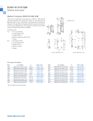EURO 90 SYSTEM 14 Modular front panel Modular front panel EURO 90 3HE / 6HE This series of aluminium front panels in Alodine 1000 treated surface completes the range from page 10. The card can be 0730 (kit C-0757) fitted through a noryl V0 bracket. It is assembled on EURO 90 subrack and caseframe through a fast turn special screw with- out the use of tapped strips. The following models have a larger range of modular front panels available. Contents of kit: 3U 1 front panel 0729... 2 noryl bracket 0730 1 handle C0733... 4 fast turn special screw C0725 + fixings 6U 1 front panel 0729... 4 noryl bracket 0730 2 handle C0733... 4 fast turn C0725 + fixings Material: Alluminium 2.5 mm Material: Alluminium 2.5 mm Ordering information Unit Description A Order code Unit Description A Order code 3HE Modular front panel 11TE 55.54 *C0731-11A 6HE Modular front panel 11TE 55.54 *C0731-61A 3HE Modular front panel 12TE 60.62 C0731-12A 6HE Modular front panel 12TE 60.62 *C0731-62A 3HE Modular front panel 14TE 70.78 C0731-14A 6HE Modular front panel 14TE 70.78 *C0731-64A 3HE Modular front panel 15TE 75.86 *C0731-15A 6HE Modular front panel 15TE 75.86 *C0731-65A 3HE Modular front panel 16TE 80.94 C0731-16A 6HE Modular front panel 16TE 80.94 *C0731-66A 3HE Modular front panel 18TE 91.1 C0731-18A 6HE Modular front panel 18TE 91.1 *C0731-68A 3HE Modular front panel 20TE 101.26 *C0731-20A 6HE Modular front panel 20TE 101.26 *C0731-70A 3HE Modular front panel 21TE 106.34 C0731-21A 6HE Modular front panel 21TE 106.34 *C0731-71A 3HE Modular front panel 27TE 136.82 *C0731-27A 6HE Modular front panel 27TE 136.82 *C0731-77A 3HE Modular front panel 28TE 141.9 *C0731-28A 6HE Modular front panel 28TE 141.9 *C0731-78A * M.O.Q. (Minimum order quantity) www.apw.eu.com