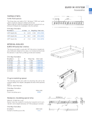 EURO 90 SYSTEM Accessories 19 TAPPED STRIPS To fix front panels The fixing strips are made of 5x2 flat brass 2.5MA and perfo- rated in holes at a distance of M2.5 at 5.08 mm. Tapped strip are ordered separately and are required to fix un- foreseen front panels or backplane onto the subrack. Ordering information Description N. holes A Weight Kg Order code 84TE tapped strip 84 426.6 0.035 0591-01ZIN 60TE tapped strip 60 304.7 0.025 0591-03ZIN 42TE tapped strip 42 213.3 0.018 0591-04ZIN INTERNAL SHELVES EURO 90 horizontal shelves The horizontal shelf is made with 15/10 aluminium treated alo- dine 1000 and is folded on four sides. Can be fixed on the inside the subrack or case frame, all fixing screws are included. Ordering information Description A B Weight Kg Order code 42 TE/160 218 164 0.180 C1066-01A 42 TE/220 218 224 0.240 C1066-02A 42 TE/280 218 284 0.300 C1066-03A 84 TE/160 431.3 164 0.400 C1066-31A 84 TE/220 431.3 224 0.480 C1066-32A 84 TE/280 431.3 284 0.560 C1066-33A 84 TE/340 431.3 344 0.640 C1066-34A Plug-in insulating spacer The isolating spacers are useful for attaching the card to the modular drawer.The depth is adaptable for DIN 41612 and DIN 41617. Material: Black Macralon. Ordering information Description Order code Plugh-in insulating spacer A0745 Backplane insulating spacer strip Material: V0 light blue noryl. Spacer strips are needed to insulate the backplane and to pro- vide the correct depth dimension of PCB and plug-in modules. Ordering information Description Order code Backplane insulating spacer strip 0755