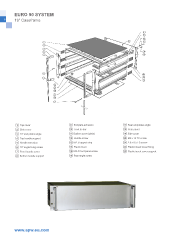 EURO 90 SYSTEM 6 19” Caseframe 1 Top cover 9 Endplate extrusion 17 Rear endplates angle 2 Side cover 10 Front tie bar 18 Rear panel 3 19” end plates angle 11 Bottom cover (plain) 19 Side cover 4 Top handle support 12 Handle screw 20 M4 x 14 TC screw 5 Handle extrusion 13 M2.5 tapped strip 21 2.9 x 9.5 TS screw 6 19” angle fixing screw 14 Plastic bush 22 Plastic insert cover fixing 7 Front handle cover 15 M2.5 front panel screw 23 Plastic insert cover support 8 Bottom handle support 16 Rear angle screw www.apw.eu.com