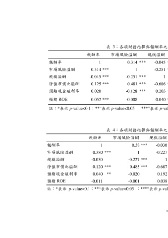 表 3:各項財務指標與報酬率之相關係數表 (自行預測每股盈餘)