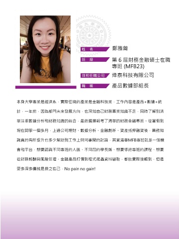 識真的有所提升也多少幫助到工作上與同事間的討論,其實清華MFB專班就是一個機