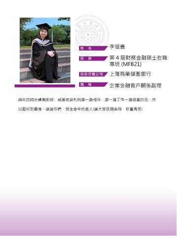 李倍嘉 第 4 屆財務金融碩士在職 專班 (MFB21) 上海商業儲蓄銀行 企業金融客戶關係副理 兩年的時光轉瞬即逝,感謝老師和同學一路相伴,讓一面工作一面讀書的我,得 以堅持到最後。謝謝你們,我生命中的貴人!願大家展翅高飛,珍重再見!