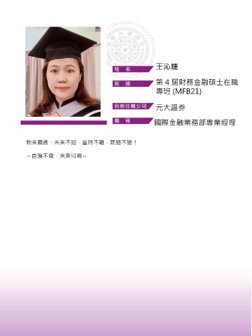 王沁婕 第 4 屆財務金融碩士在職 專班 (MFB21) 元大證券 國際金融業務部專業經理 物來順應,未來不迎,當時不雜,既過不戀! ~自強不息,未來可期~