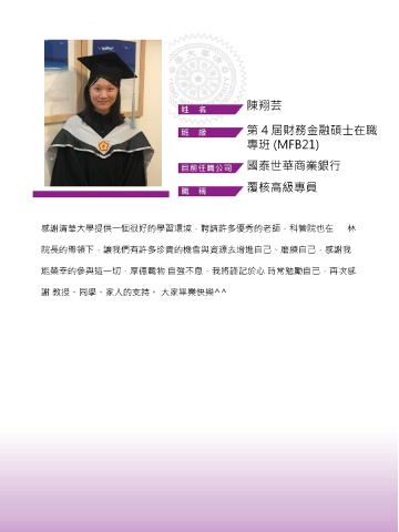 陳翔芸 第 4 屆財務金融碩士在職 專班 (MFB21) 國泰世華商業銀行 覆核高級專員 感謝清華大學提供一個很好的學習環境,聘請許多優秀的老師,科管院也在 林 院長的帶領下,讓我們有許多珍貴的機會與資源去增進自己、磨練自己,感謝我 能榮幸的參與這一切,厚德載物 自強不息,我將謹記於心 時常勉勵自己,再次感 謝 教授、同學、家人的支持。 大家畢業快樂^^