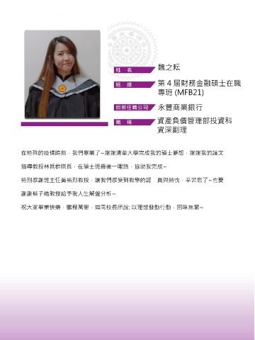 魏之耘 第 4 屆財務金融碩士在職 專班 (MFB21) 永豐商業銀行 資產負債管理部投資科 資深副理 在特殊的疫情時刻,我們畢業了~謝謝清華大學完成我的碩士夢想,謝謝我的論文 指導教授林哲群院長,在碩士班最後一哩路,協助我完成~ 特別感謝班主任黃裕烈教授,讓我們感受到教學的認 真與熱忱,辛苦您了~也要 謝謝蔡子皓教授給予我人生解盤分析~ 祝大家畢業快樂,鵬程萬里,如同校長所說: 以理想發動行動,回味無窮~