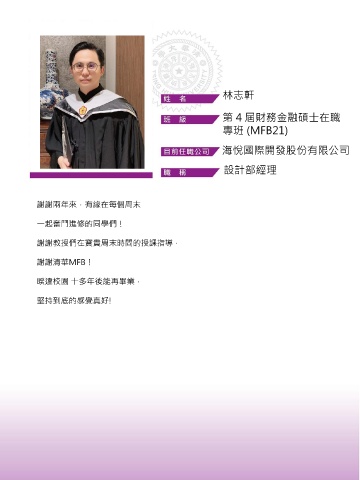 林志軒 第 4 屆財務金融碩士在職 專班 (MFB21) 海悅國際開發股份有限公司 設計部經理 謝謝兩年來,有緣在每個周末 一起奮鬥進修的同學們! 謝謝教授們在寶貴周末時間的授課指導, 謝謝清華MFB! 睽違校園 十多年後能再畢業, 堅持到底的感覺真好!