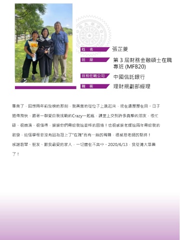 張芷菱 第 3 屆財務金融碩士在職 專班 (MFB20) 中國信託銀行 理財規劃部經理 畢業了,回想兩年前放榜的那刻,我興奮的從位子上跳起來,現在還歷歷在目。日子 過得飛快,跟著一群愛自我挑戰的Crazy一起瘋,課堂上交到許多真摯的朋友,很忙 碌、很崩潰、很值得,謝謝你們帶給我這麼棒的回憶!也很感謝老師這兩年帶給我的 啟發,這個學程並沒有因為冠上了"在職"而有一絲的稀釋,很感恩老師的堅持! 感謝前輩、朋友、跟我最愛的家人,一切盡在不言中。2020/6/13,我從清大畢業 了!