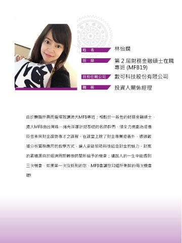 林怡嫺 第 2 屆財務金融碩士在職 專班 (MFB19) 數可科技股份有限公司 投資人關係經理 由於轉職所需而選擇就讀清大MFB專班;相較於一般性的財務金融碩士, 清大MFB由台灣唯一擁有深厚計財基礎的名師群們,傾全力規劃為培養 符合未來財金趨勢專才之課程。在課堂上除了財金專業培養外,透過數 據分析實務應用的教學方式,讓人更能領略科技結合財金的魅力。財富 的累積源自於經濟周期轉換時間所給予的機會;據說人的一生中能遇到 三次機會,如果第一次沒抓到的您,MFB會讓您知道所剩餘的兩次機會 喔!