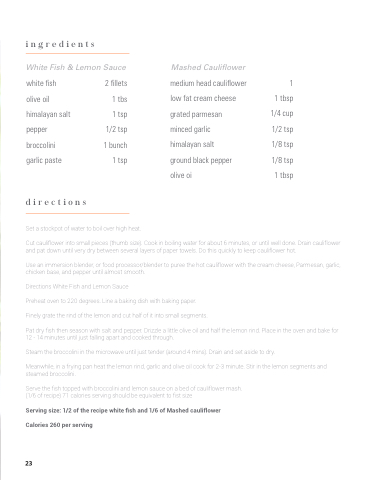 Serving size: 1/2 of the recipe white fish and 1/6 of Mashed cauliflower Calories 260 per serving