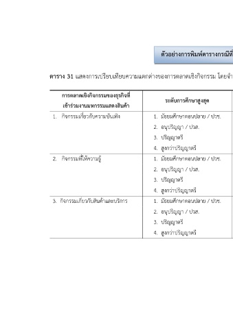 ตาราง 31 แสดงการเปรียบเทียบความแตกต่างของการตลาดเชิงกิจกรรม โดยจ้าแนกตามระดับการศึกษาสูงสุดของผู้บริโภคที่เข้าร่วมงานมหกรรมแสดงสินค้า