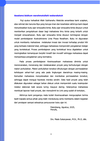 menyelesaikan buku ajar wirausaha kimia. Buku ajar wirausaha kimia disusun untuk