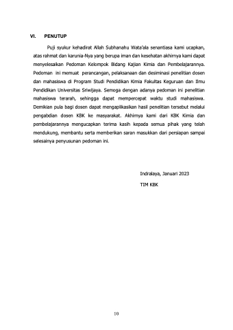 Puji syukur kehadirat Allah Subhanahu Wata’ala senantiasa kami ucapkan, atas rahmat dan karunia-Nya yang berupa iman dan kesehatan akhirnya kami dapat menyelesaikan Pedoman Kelompok Bidang Kajian Kimia dan Pembelajarannya. Pedoman ini memuat perancangan, pelaksanaan dan desiminasi penelitian dosen dan mahasiswa di Program Studi Pendidikan Kimia Fakultas Keguruan dan Ilmu Pendidikan Universitas Sriwijaya. Semoga dengan adanya pedoman ini penelitian mahasiswa terarah, sehingga dapat mempercepat waktu studi mahasiswa. Demikian pula bagi dosen dapat mengaplikasikan hasil penelitian tersebut melalui pengabdian dosen KBK ke masyarakat. Akhirnya kami dari KBK Kimia dan pembelajarannya mengucapkan terima kasih kepada semua pihak yang telah mendukung, membantu serta memberikan saran masukkan dari persiapan sampai selesainya penyusunan pedoman ini.