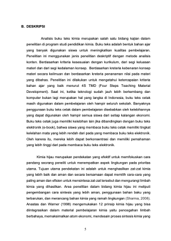 Analisis buku teks kimia merupakan salah satu bidang kajian dalam penelitian di program studi pendidikan kimia. Buku teks adalah bentuk bahan ajar yang banyak digunakan siswa untuk meningkatkan kualitas pembelajaran. Penelitian ini menggunakan jenis penelitian deskriptif dengan metode analisis konten. Berdasarkan kriteria kesesuaian dengan kurikulum, dari segi keluasan materi dan dari segi kedalaman konsep. Berdasarkan kreteria kebenaran konsep materi secara keilmuan dan berdasarkan kreteria penanaman nilai pada materi yang dibahas. Penelitian ini dilakukan untuk mengetahui ketercapaian kriteria bahan ajar yang baik menurut 4S TMD (Four Steps Teaching Material Development). Saat ini, ketika teknologi sudah jauh lebih berkembang dan komputer bukan lagi merupakan hal yang langka di Indonesia, buku teks cetak masih digunakan dalam pembelajaran oleh hampir seluruh sekolah. Banyaknya penggunaan buku teks cetak dalam pembelajaran disebabkan oleh kelebihannya yang dapat digunakan oleh hampir semua siswa dari setiap kalangan ekonomi. Buku teks cetak juga memiliki kelebihan lain jika dibandingkan dengan buku teks elektronik (e-book), bahwa siswa yang membaca buku teks cetak memiliki tingkat kelelahan mata yang lebih rendah dari pada yang membaca buku teks elektronik. Oleh karena itu, mereka lebih dapat berkonsentrasi dan memiliki pemahaman yang lebih tinggi dari pada membaca buku teks elektronik.