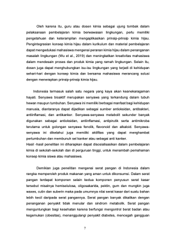 Oleh karena itu, guru atau dosen kimia sebagai ujung tombak dalam pelaksanaan pembelajaran kimia berwawasan lingkungan, perlu memiliki pengetahuan dan keterampilan mengaplikasikan prinsip-prinsip kimia hijau. Pengintegrasian konsep kimia hijau dalam kurikulum dan material pembelajaran dapat mengedukasi mahasiswa mengenai peranan kimia hijau dalam penanganan masalah lingkungan (Wu et al., 2019) dan meningkatkan kreativitas mahasiswa dalam mendesain proses dan produk kimia yang ramah lingkungan. Selain itu, dosen juga dapat menghubungkan isu-isu lingkungan yang terjadi di kehidupan sehari-hari dengan konsep kimia dan bersama mahasiswa merancang solusi dengan menerapkan prinsip-prinsip kimia hijau.
