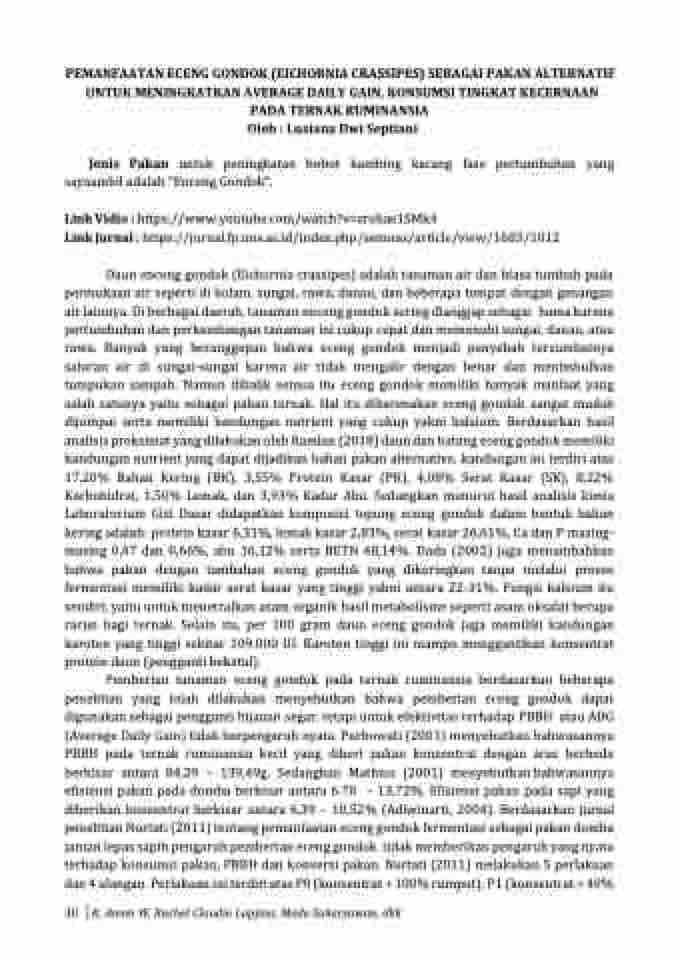 PEMANFAATAN ECENG GONDOK (EICHORNIA CRASSIPES) SEBAGAI PAKAN ALTERNATIF UNTUK MENINGKATKAN AVERAGE DAILY GAIN, KONSUMSI TINGKAT KECERNAAN