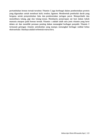 pertumbuhan hewan ternak tersebut. Vitamin C juga berfungsi dalam pembentukan protein yang digunakan untuk membuat kulit, tendon, ligamen. Membentuk pembuluh darah yang berguna untuk penyembuhan luka dan pembentukan jaringan parut. Memperbaiki dan memelihara tulang, gigi dan tulang rawan. Membantu penyerapan zat besi dalam tubuh manusia ataupun pada hewan ternak. Vitamin c adalah salah satu jenis vitamin yang larut dalam air dan memiliki peranan penting dalam menangkal berbagai penyakit. Vitamin C termasuk golongan vitamin antioksidan yang mampu menangkal berbagai radikal bebas ekstraselular. Hasilnya adalah terbentuk warna biru.