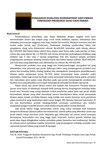 Tita M. 2020. Pengaruh Kualitas Konsentrat Sapi Perah Terhadap Produksi Susu Sapi Perah. Jurnal Peternakan. 2(1) : 46-54.