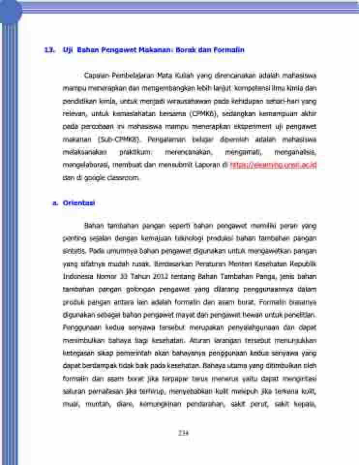 13. Uji Bahan Pengawet Makanan: Borak dan Formalin Capaian Pembelajaran Mata Kuliah yang direncanakan adalah mahasiswa mampu menerapkan dan mengembangkan lebih lanjut kompetensi ilmu kimia dan pendidikan kimia, untuk menjadi wirausahawan pada kehidupan sehari-hari yang relevan, untuk kemaslahatan bersama (CPMK6), sedangkan kemampuan akhir pada percobaan ini mahasiswa mampu menerapkan eksperiment uji pengawet makanan (Sub-CPMK8). Pengalaman belajar diperoleh adalah mahasiswa melaksanakan praktikum: merencanakan, mengamati, menganalisis, mengelaborasi, membuat dan mensubmit Laporan di https://elearning.unsri.ac.id dan di google classroom. a. Orientasi Bahan tambahan pangan seperti bahan pengawet memiliki peran yang penting sejalan dengan kemajuan teknologi produksi bahan tambahan pangan sintetis. Pada umumnya bahan pengawet digunakan untuk mengawetkan pangan yang sifatnya mudah rusak. Berdasarkan Peraturan Menteri Kesehatan Republik Indonesia Nomor 33 Tahun 2012 tentang Bahan Tambahan Panga, jenis bahan tambahan pangan golongan pengawet yang dilarang penggunaannya dalam produk pangan antara lain adalah formalin dan asam borat. Formalin biasanya digunakan sebagai bahan pengawet mayat dan pengawet hewan untuk penelitian. Penggunaan kedua senyawa tersebut merupakan penyalahgunaan dan dapat menimbulkan bahaya bagi kesehatan. Aturan larangan tersebut menunjukkan ketegasan sikap pemerintah akan bahayanya penggunaan kedua senyawa yang dapat berdampak tidak baik pada kesehatan. Bahaya utama yang ditimbulkan oleh formalin dan asam borat jika terpapar terus menerus yaitu dapat mengiritasi saluran pernafasan jika terhirup, menyebabkan kulit melepuh jika terkena kulit, mual, muntah, diare, kemungkinan pendarahan, sakit perut, sakit kepala, 234