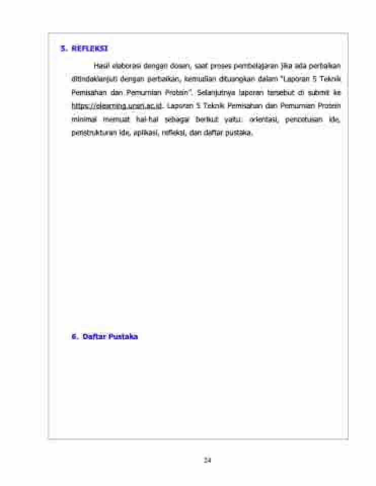 Hasil elaborasi dengan dosen, saat proses pembelajaran jika ada perbaikan ditindaklanjuti dengan perbaikan, kemudian dituangkan dalam “Laporan 5 Teknik Pemisahan dan Pemurnian Protein”. Selanjutnya laporan tersebut di submit ke https://elearning.unsri.ac.id. Laporan 5 Teknik Pemisahan dan Pemurnian Protein minimal memuat hal-hal sebagai berikut yaitu: orientasi, pencetusan ide, penstrukturan ide, aplikasi, refleksi, dan daftar pustaka.