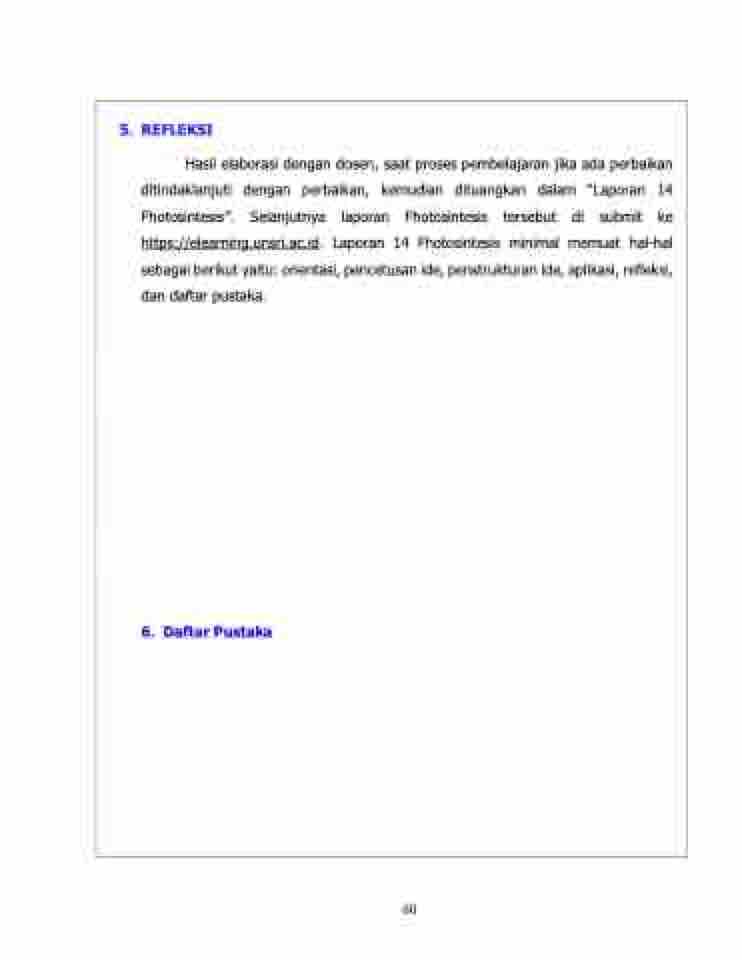 Hasil elaborasi dengan dosen, saat proses pembelajaran jika ada perbaikan ditindaklanjuti dengan perbaikan, kemudian dituangkan dalam “Laporan 14 Fhotosintesis”. Selanjutnya laporan Fhotosintesis tersebut di submit ke https://elearning.unsri.ac.id. Laporan 14 Fhotosintesis minimal memuat hal-hal sebagai berikut yaitu: orientasi, pencetusan ide, penstrukturan ide, aplikasi, refleksi, dan daftar pustaka.