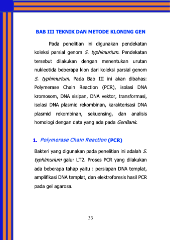 Pada penelitian ini digunakan pendekatan koleksi parsial genom S. typhimurium. Pendekatan tersebut dilakukan dengan menentukan urutan nukleotida beberapa klon dari koleksi parsial genom S. typhimurium. Pada Bab III ini akan dibahas: Polymerase Chain Reaction (PCR), isolasi DNA kromosom, DNA sisipan, DNA vektor, transformasi, isolasi DNA plasmid rekombinan, karakterisasi DNA plasmid rekombinan, sekuensing, dan analisis homologi dengan data yang ada pada GenBank.
