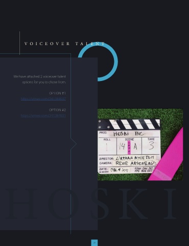 V O I CEO VER T ALENT We have attached 2 voiceover talent options for you to chose from: OPTION #1 https://vimeo.com/341384937 OPTION #2 https://vimeo.com/341384931 HO SKI 20