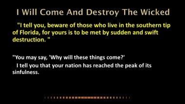 "I tell you, beware of those who live in the southern tip of Florida, for yours is to be met by sudden and swift destruction. " "You may say, 'Why will these things come?' I tell you that your nation has reached the peak of its sinfulness.