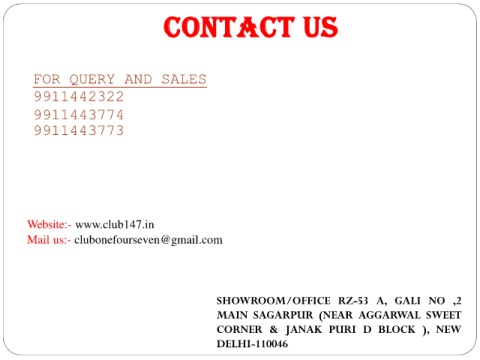 CONTACT US FOR QUERY AND SALES 9911442322 9911443774 9911443773 Website:- www.club147.in Mail us:- clubonefourseven@gmail.com SHOWROOM/OFFICE RZ-53 A, GALI NO ,2 MAIN SAGARPUR (NEAR AGGARWAL SWEET CORNER & JANAK PURI D BLOCK ), NEW DELHI-110046