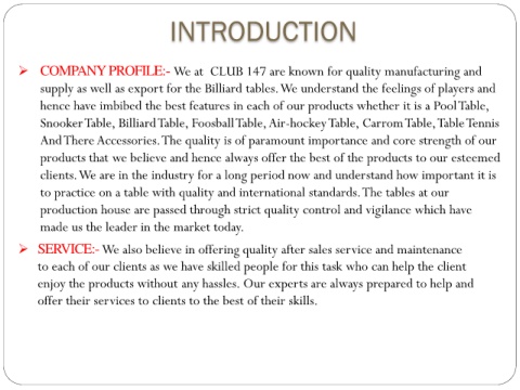 supply as well as export for the Billiard tables. We understand the feelings of players and
