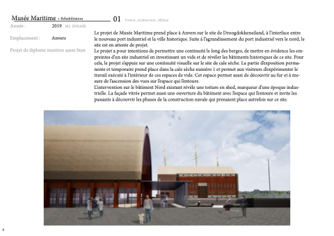 Le projet a pour intentions de permettre une continuité le long des berges, de mettre en évidence les em- preintes d’un site industriel en investissant un vide et de révéler les bâtiments historiques de ce site. Pour cela, le projet s’appuie sur une continuité visuelle sur le site de cale sèche. La partie d’exposition perma- nente et temporaire prend place dans la cale sèche numéro 1 et permet aux visiteurs d’expérimenter le travail exécuté à l’intérieur de ces espaces de vide. Cet espace permet aussi de découvrir au fur et à me- sure de l’ascension des vues sur l’espace qui l’entoure.