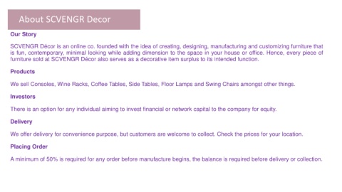 SCVENGR Décor is an online co. founded with the idea of creating, designing, manufacturing and customizing furniture that