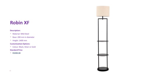 Robin XF Description: ▪ Material: Mild Steel ▪ Base: 200 mm in diameter ▪ Height: 1400 mm Customization Options: ▪ Colour: Black, Silver or Gold Standard Price ▪ R3200.00 10/2/2019 22 ADD A FOOTER