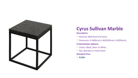 Cyrus Sullivan Marble Description: ▪ Material: Mild Steel and stone ▪ Dimension: H (600mm) x W(6500mm) x D(650mm) Customization Options: ▪ Colour: Black, Silver or White ▪ Top: Wooded or metal sheet Standard Price ▪ R1800 25
