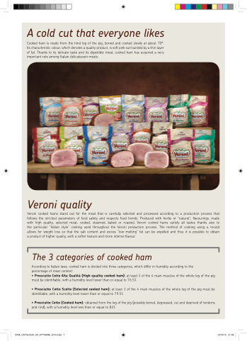 Veroni cooked hams stand out for the meat that is carefully selected and processed according to a production process that follows the strictest parameters of food safety and respects food trends. Produced with herbs or “natural”, flavourings, made with high quality, selected meat, cooked, steamed, baked or roasted, Veroni cooked hams satisfy all tastes thanks also to the particular “Italian style” cooking used throughout the Veroni production process. The method of cooking using a mould allows for weight loss so that the salt content and excess “low-melting” fat can be expelled and thus it is possible to obtain a product of higher quality, with a softer texture and more intense flavour.